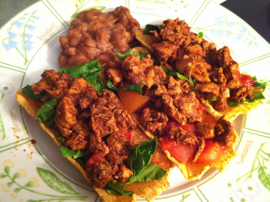 Last night we had taco trays w/ salad, chicken and spicy beans on the side.