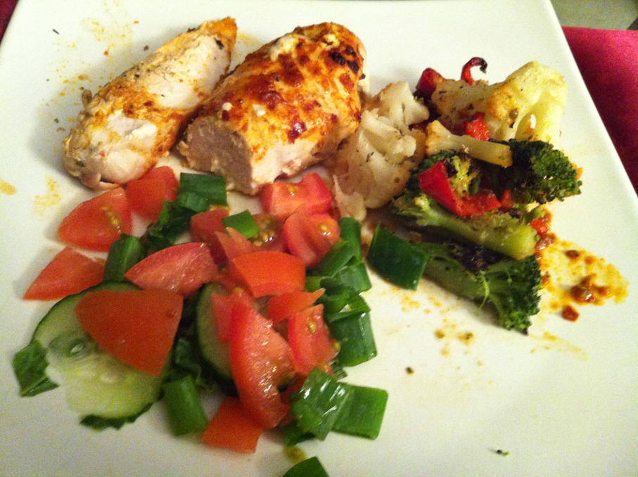 Dinner tonight was roast veggies (sweet red pepper, cauliflower and broccoli) with chicken and salad. It was pretty easy, just whacked everything into one non-stick pan, seasoned the veggies, poured some Nando’s Hot Marinade on the chicken and baked it covered for 25 minutes, then took the cover off for the last 10. Yum!